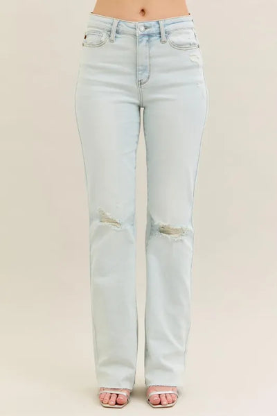 These stunning light blue high-waisted straight leg jeans feature fashion distressed detailing at the knees for an effortlessly cool look. Crafted from premium cotton denim blend, they offer comfortable stretch and durability. The high-rise waistline creates a flattering silhouette while the straight leg cut provides a timeless appeal. Perfect for casual outings or dressed up occasions, these jeans showcase carefully placed rips and fading for an authentic vintage-inspired aesthetic. The light wash denim pairs beautifully with any top, making them a versatile wardrobe essential.