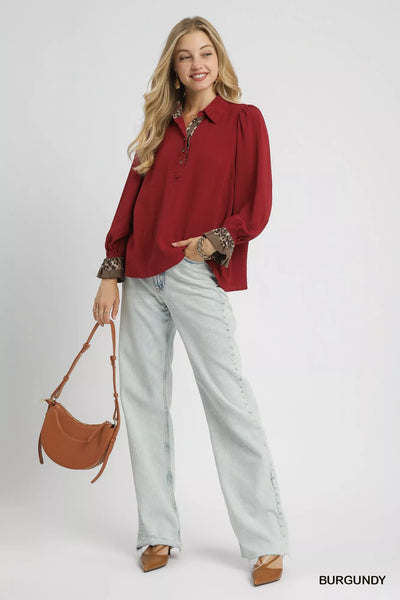 The Half Button Blouse with Leopard Print Trim is a trendy and eye-catching piece for your wardrobe. The leopard print trim adds a fun and playful touch to the classic design. Featuring a half-button front, this blouse offers a versatile and stylish look. Made from comfortable and lightweight fabric, it is perfect for all-day wear. Pair it with your favorite jeans or skirt for a fashionable ensemble.