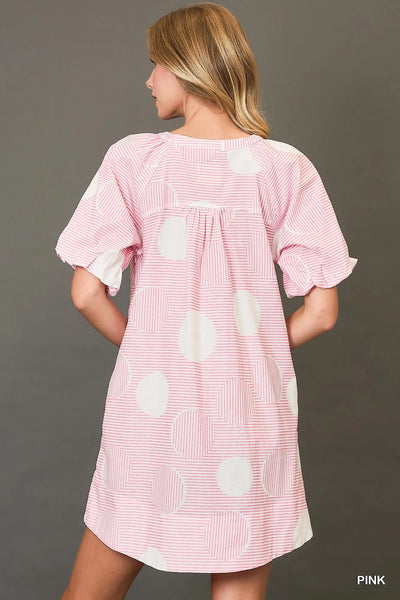 This button-down puff sleeve mini dress features a playful combination of stripe and dot prints, creating a unique and eye-catching look. The puff sleeves add a touch of drama and femininity, elevating the overall style of the dress. The button-down design adds a classic element, making it easy to wear and style. With its mini length, this dress is perfect for both casual outings and special occasions. Embrace a trendy and chic aesthetic with this statement-making piece that is sure to turn heads. Upgrade your wardrobe with this versatile dress that seamlessly blends playful prints with flattering details.